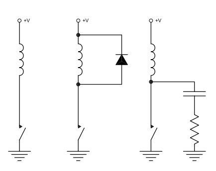 切換電感負(fù)載如繼電器,螺線管,線圈計算器,小型馬達(dá)或電感電路等都需要防護(hù)電路去延長干簧開關(guān)的壽命(見下圖)。公式#1 描述感應(yīng)性的關(guān)系。一旦電流流過電感器,它會傾向維持這個電流,如果這電流突然間終結(jié),公式#1內(nèi)的di/dt可以變得很大,這凈效應(yīng)可以由大的電流流經(jīng)過開關(guān)造成。在開關(guān)打時,電弧放電會隨之而起,如果這電弧放電持續(xù)產(chǎn)生則會造成開關(guān)破裂。很多時候可通過加設(shè)RC 網(wǎng)絡(luò)和二極管遏抑器令雙方互相抑制(見下圖)。