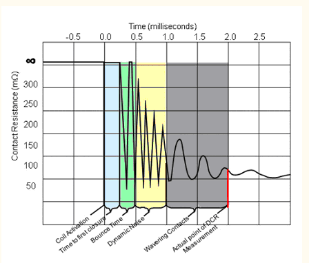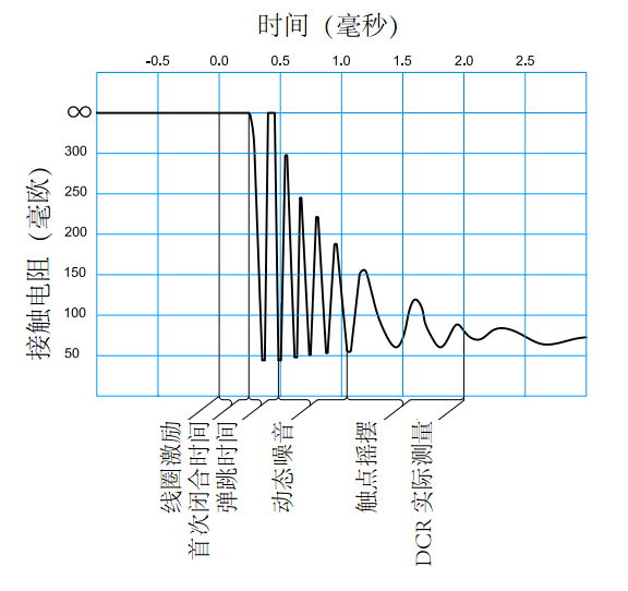 一個典型動態(tài)接觸電阻波形圖,顯示初期的閉合,振蕩,動態(tài)噪聲及波動期的擺動狀況